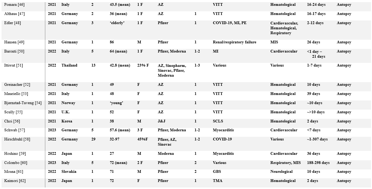 From the selected studies, two authors (NH and PAM) independently extracted the following data into Microsoft Excel: year published, country where the study was conducted, and all available individual case information (age, sex, brand of COVID-19 vaccine, cumulative number of COVID-19 vaccine doses administered, days from last COVID-19 vaccine administration to death, post-mortem findings, and type of post-mortem procedure). Any discrepancies in data were resolved by discussion and re-extraction of the data. Given the presence of some missing data, all available information was used to calculate descriptive statistics. Estimated age (exact age not given) and inferred time from last vaccine administration to death (no definitive time given) were excluded from calculations and figures. Because the state of knowledge regarding COVID-19 vaccine safety has advanced since the time of the original publications, we performed a contemporary review: three physician experts (RH, WM, PAM) with experience in death adjudication and anatomical/clinical pathology independently reviewed the available evidence of each case (Table S1), including demographic information, clinical vignette, vaccination data, gross and histologic autopsy findings, and determined whether or not COVID-19 vaccination was the direct cause or contributed significantly to the mechanism of death described. The physicians assessed the temporal relationships, strength of evidence and consistency of findings with reported characteristics and common presentations of COVID-19 vaccine-associated deaths documented in VAERS [15], and other potential etiologies to adjudicate each case. Agreement was reached when two or more physicians adjudicated a case concordantly. For the study by Chaves [23], only cardiovascular and hematological system-related cases were adjudicated as being linked to the vaccine due to a high probability of COVID-19 vaccination contributing to death. This high-probability assessment was supported by evaluating similar cases documented in VAERS, where cardiovascular and hematological adverse events represent a significant portion of serious adverse event reports [15]. Individual case information was missing for other cases, limiting adjudication for non-cardiovascular or hematological outcomes.