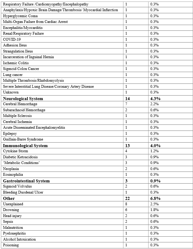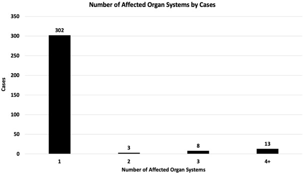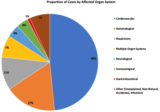 The cardiovascular system was most frequently implicated (49%), followed by hematological (17%), respiratory (11%), multiple organ systems (7%), neurological (4%), immunological (4%), and gastrointestinal (1%). In 7% of cases, the cause of death was either unknown, non-natural (drowning, head injury, etc.) or infection (Figure 2). One organ system was affected in 302 cases, two in 3 cases, three in 8 cases, and four or more in 13 cases (Figure 3).