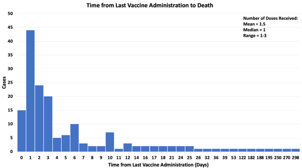 Distribution of Time from Last Vaccine Administration to Death Among Cases