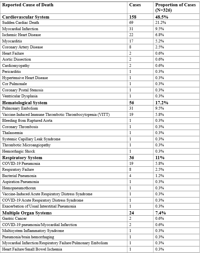 Table 2 shows the number and proportion of each reported cause of death. Sudden cardiac death was the most common cause of death (21.2%), followed by myocardial infarction (9.5%), pulmonary embolism (9.5%), ischemic heart disease (6.8%), VITT (5.8%), COVID-19 pneumonia (5.8%), myocarditis/pericarditis (5.5%), cerebral/subarachnoid hemorrhage (2.8%), coronary artery disease (2.5%), respiratory failure (2.5%), and unexplained (2.5%).