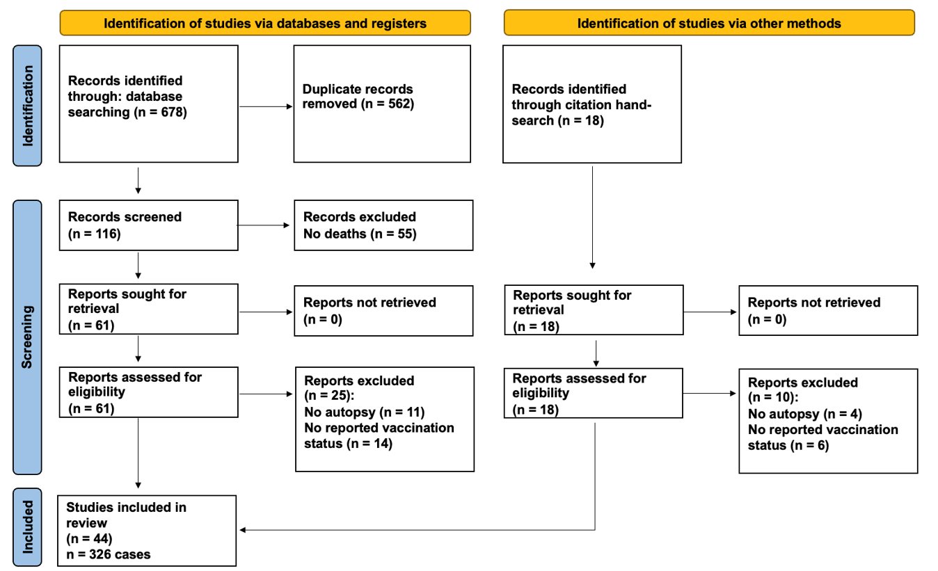 All original articles, randomized clinical trials, case reports, and case series that contain autopsy or organ-restricted autopsy (gross and histologic analysis of a single organ) results with COVID-19 vaccines as an antecedent exposure were included. Review articles, systematic reviews, meta-analyses, papers with no autopsy or organ-restricted autopsy results, non-human studies, and papers with no reported COVID-19 vaccination status were excluded. The authors’ conclusions were not considered for study inclusion to avoid bias. Two authors (NH and PAM) independently screened the full text of all retrieved studies to assess their eligibility for inclusion and removed all ineligible/duplicate studies. Any disagreements for inclusion of an article were resolved by discussion until agreement was reached.