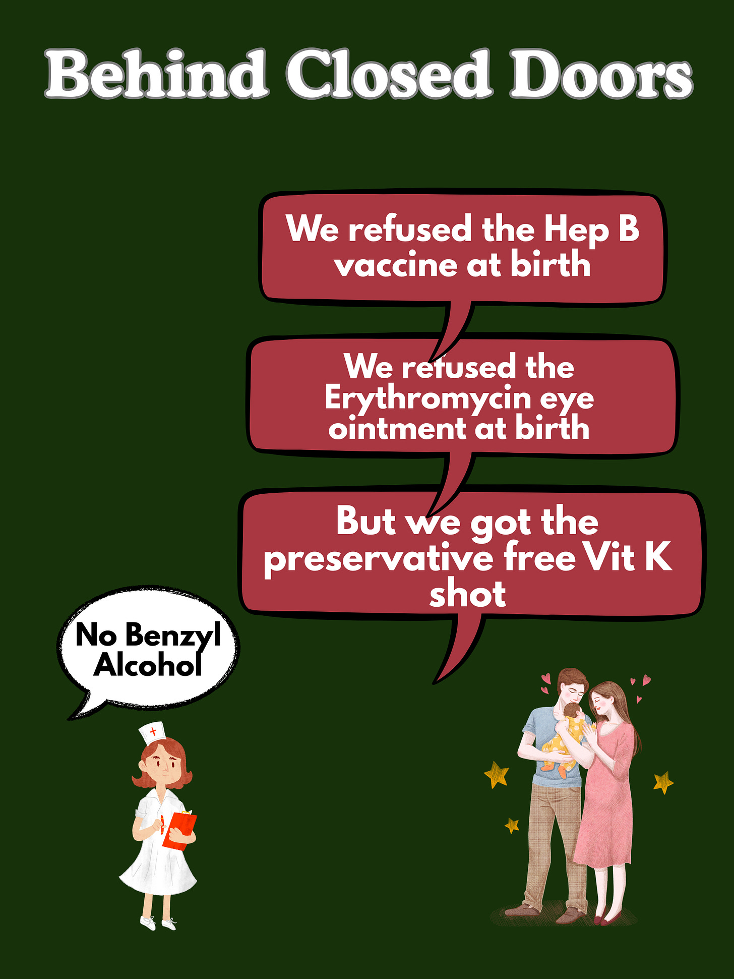 This is an example of informed choice, where the parents researched their options and made them known upon arriving for delivery. Most people do not know there is a preservative free Vitamin K shot available, free of benzyl alcohol, propylene glycol and polysorbate 80.